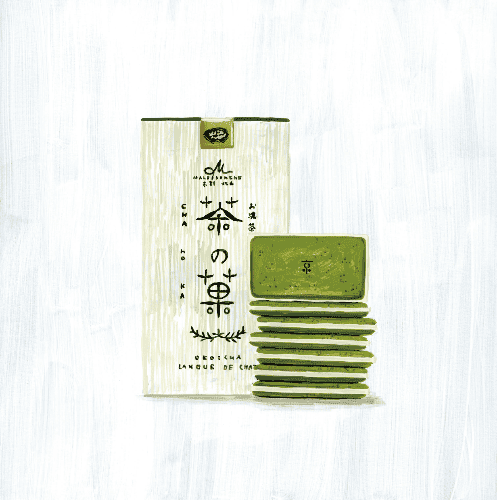 ロマンライフの中核ブランド・マールブランシュのお濃茶ラングドシャ「茶の菓」。平成19(2007)年の発売以来、地元住人に選ばれる京都土産として、人気を博している。
