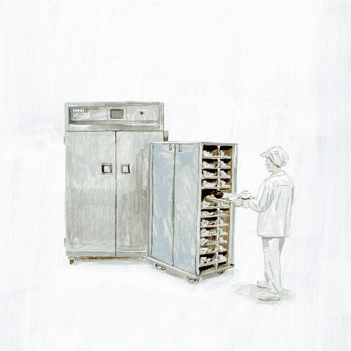 中島製作所開発の「ミールシャトル」。業界初のマイクロ波方式を採用し、50分かかる食事の再加熱を約10分に短縮しただけでなく、従来の熱風式による風味の低下も解決した。