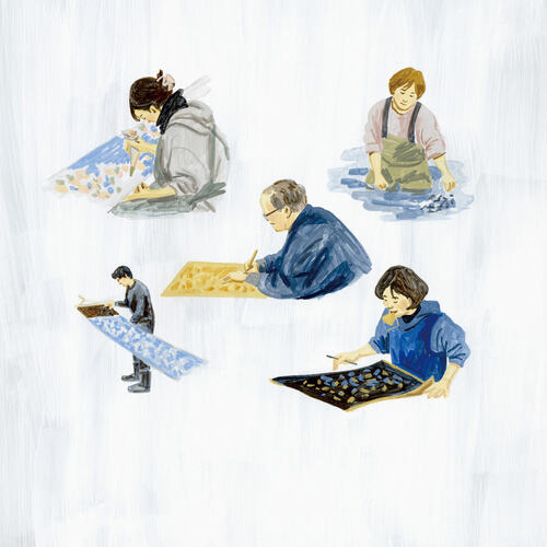 「型彫り」や「糊置き」、「地染め」、「水元」といった「和染紅型」を支える精緻な手仕事。この職人たちの手仕事の連なりが栗山工房の真摯なものづくりを支えている。